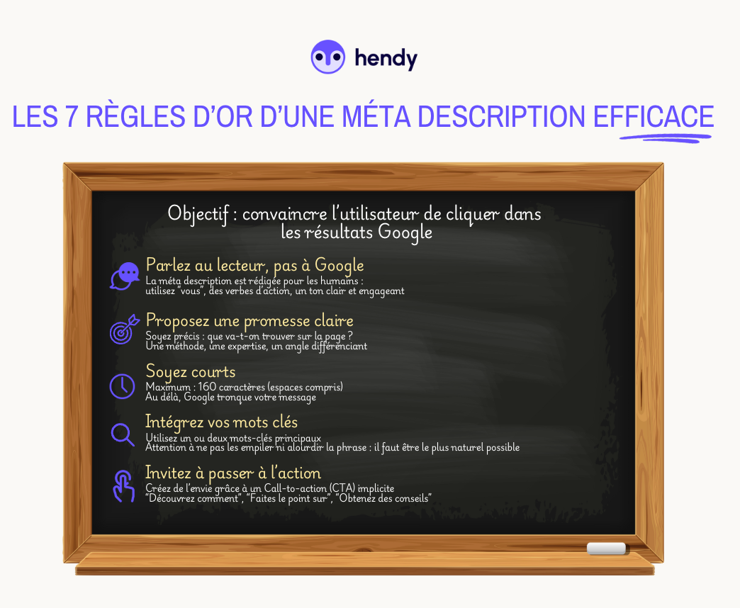 Prenons une vraie méta description affichée par Hendy, notre agence (oui, on est fiers de notre travail, donc on vous partage la recette) :
