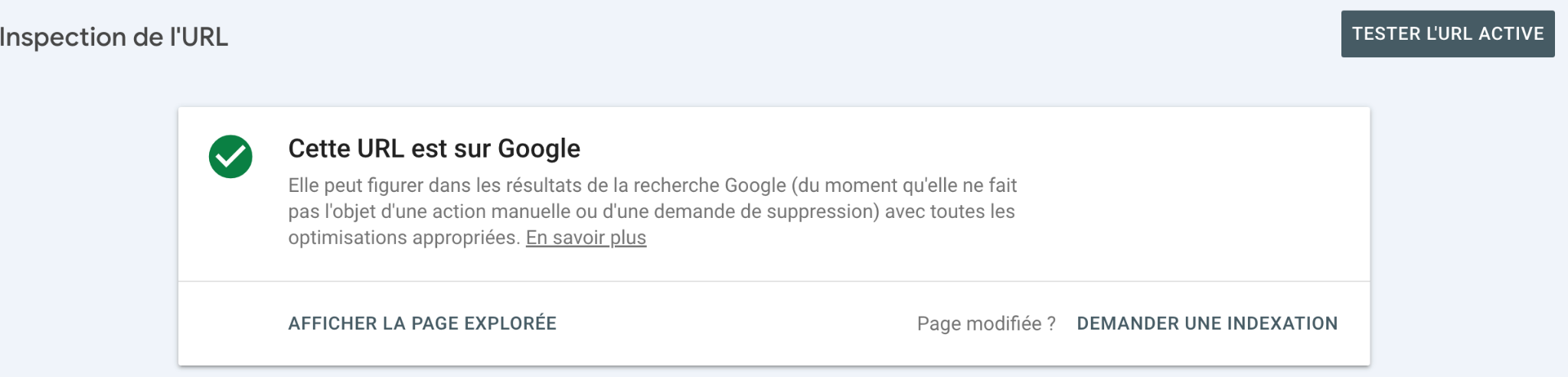 💡 Astuce : si une page importante est absente, cliquez sur “Demander une indexation”, puis revérifiez après quelques jours.