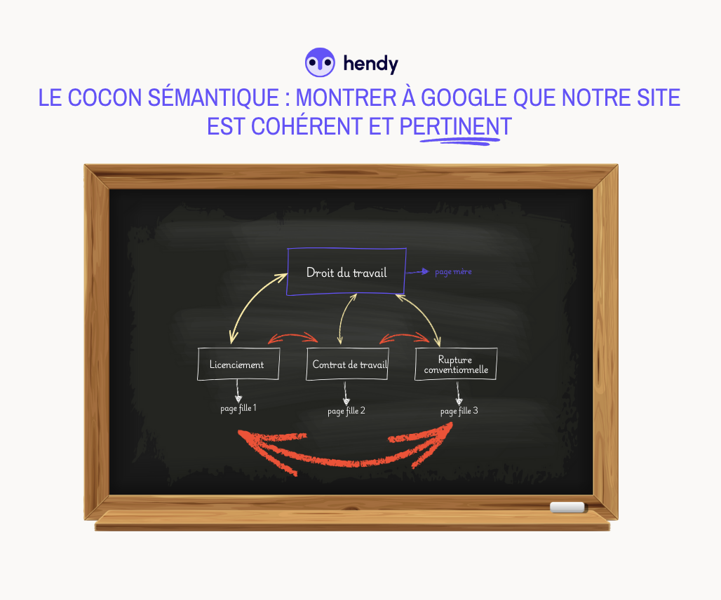 Créez des liens entre vos pages : de votre page “droit du travail” vers votre article “licenciement abusif”, de votre article vers votre formulaire de contact, etc. Cela renforce votre cocon sémantique.